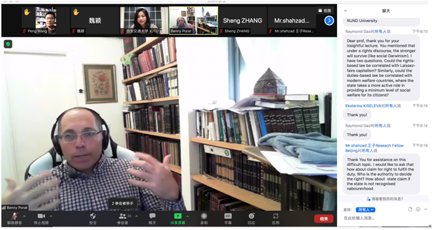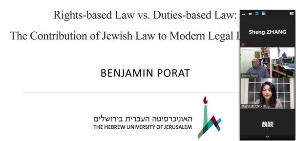 2021年9月29日下午,新丝路开云电子体育_开云(中国)联盟“院长论坛”第二讲成功举办。希伯来大学开云电子体育_开云(中国)副院长Benjamin Porat教授为联盟25所院校师生以及丝绸之路大学联盟的师生带来了题为“Rights-based Law vs Duties-based Law: The Contribution of Jewish Law to Modern Legal Discourse”的线上讲座。讲座由开云电子体育_开云(中国)开云电子体育_开云(中国)助理教授郭剑萍主持。