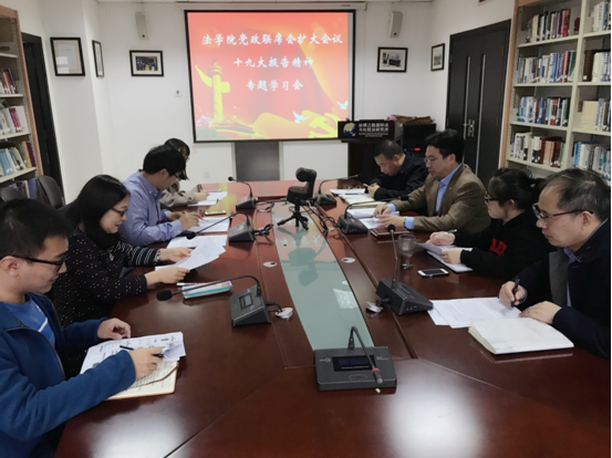 接下来,参会人员纷纷发表了学习十九大报告的感受与心得。李万强副院长、丁卫副院长表示十九大报告高屋建瓴、大气磅礴,既有高瞻远瞩又有殷切期盼。通过重点研读和交流讨论十九大报告中关于“坚持全面依法治国”这一基本方略的论述和新观点,深入分析报告中关于法治中国建设的各项政策指导,参会人员感受到在十九大报告中,法治地位确立和彰显有着的显著变化。同时,作为我校十九大精神宣讲专家团的成员,几位院领导表示通过观看十九大报告以及学习研讨自己对报告精神有了更加清晰深刻的理解,接下来还会对报告进行反复的研读和咀嚼,准确把握十九大报告精神的深刻内涵,切实做好理论宣讲工作。