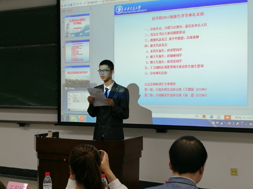 金秋送爽,丹桂飘香。9月9日下午,开云电子体育_开云(中国)2017级新生开学典礼在主C105隆重召开。开云电子体育_开云(中国)党总支书记王保民、文治书院院主任张爱萍、开云电子体育_开云(中国)副院长丁卫、院长助理吉兰湘、法复合61班班主任王玉苹、法71班班主任李琳以及开云电子体育_开云(中国)2017级全体本科生、硕士生、博士生新生参加了开学典礼。开学典礼由学生工作专职委员张乃钟老师主持。