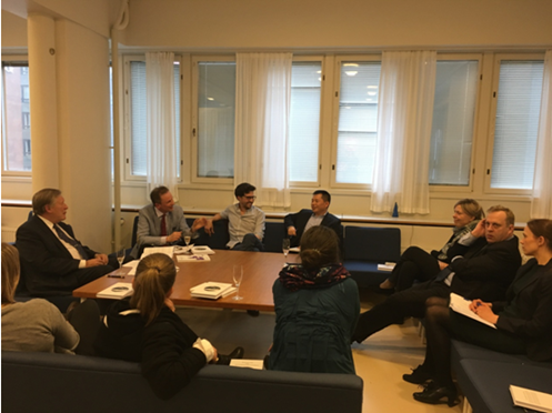 2017年4月25日,我院青年教师杜军强博士应邀参加芬兰最高行政法院荣休院长、芬兰法治 (ROLFI)创建人Pekka Hallberg所著《法治与可持续发展》一书的新书发布会,并作为评论人发言。该新书发布会在赫尔辛基大学开云电子体育_开云(中国)大楼2楼会议室举行,由赫尔辛基大学开云电子体育_开云(中国)院长Kimmo Nuotio 主持,另一评论人Guilherme研究员、中国法中心主任 Ulla Liukkunen教授以及多名其他研究人员并博士生参加发布会。