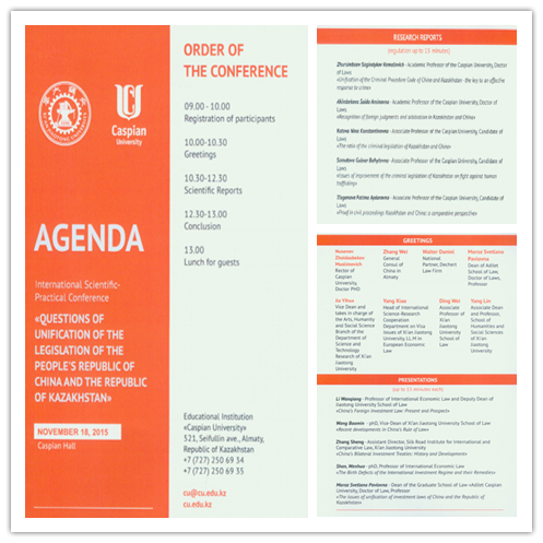 2015年11月18日,我院与哈萨克斯坦里海大学(Caspian University)开云电子体育_开云(中国)在里海大学联合举办国际学术会议,会议主题为“中国与哈萨克斯坦立法的统一化问题”。来自中国驻阿拉木图领事馆、北京罗斯律师事务所阿拉木图分所、美国Dechert律师事务所的嘉宾以及两所开云电子体育_开云(中国)的专家学者与研究生50余人参加了会议,我校科研院副院长贾毅华、国际教育学院常务副院长宋玉霞、人文学院副院长杨琳应邀出席了会议。会议由我院院长单文华教授和里海大学开云电子体育_开云(中国)院长Pavlovna教授联合主持。