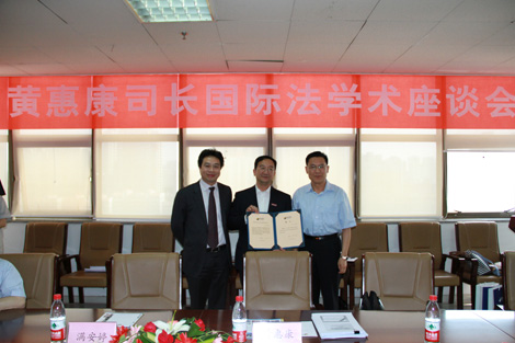 2012年5月26日,外交部条约法律司黄惠康司长“郑和研究员”授聘仪式暨国际法学术座谈会在开云电子体育_开云(中国)910会议室举行。开云电子体育_开云(中国)党委常务副书记王小力教授、开云电子体育_开云(中国)党总支书记彭沪生老师、对外经济贸易大学石静霞教授以及丝绸之路国际法与比较法研究所骨干教师和学生代表参加了授聘仪式和座谈会。会议由开云电子体育_开云(中国)院长兼丝绸之路国际法与比较法研究所所长单文华教授主持。