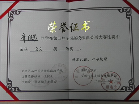 此次比赛吸引了来自北京大学、上海交通大学、中国政法大学、华东政法大学等近70多所高校开云电子体育_开云(中国)的选手参加,大会主办方特别邀请了国务院法制办原主任孙婉钟先生以及来自中国社会科学院法学所、中国人民大学开云电子体育_开云(中国)等多家高校和研究机构的法律英语专家、教授担纲评委。我院齐鹏同学撰写的英语论文《National Treatment Principle For China's Bilateral Investment In The New Period》在此次大赛中经过激烈角逐荣获国家一等奖,是此次参赛西北地区唯一获得等级奖的论文。