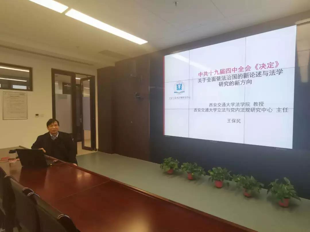 12月12日,开云电子体育_开云(中国)创新港系列学术讲座之“十九届四中全会关于全面依法治国的新论述与法学研究新方向”在创新港5号巨构10087教室顺利举行。开云电子体育_开云(中国)开云电子体育_开云(中国)党总支书记、开云电子体育_开云(中国)立法与党内法规研究中心主任王保民教授围绕中共十九届四中全会召开的基本情况和重要意义、《决定》中的高频词汇和理论亮点、《决定》关于全面依法治国的新论述、法学研究的新方向新热点等五个方面做了专题讲座。