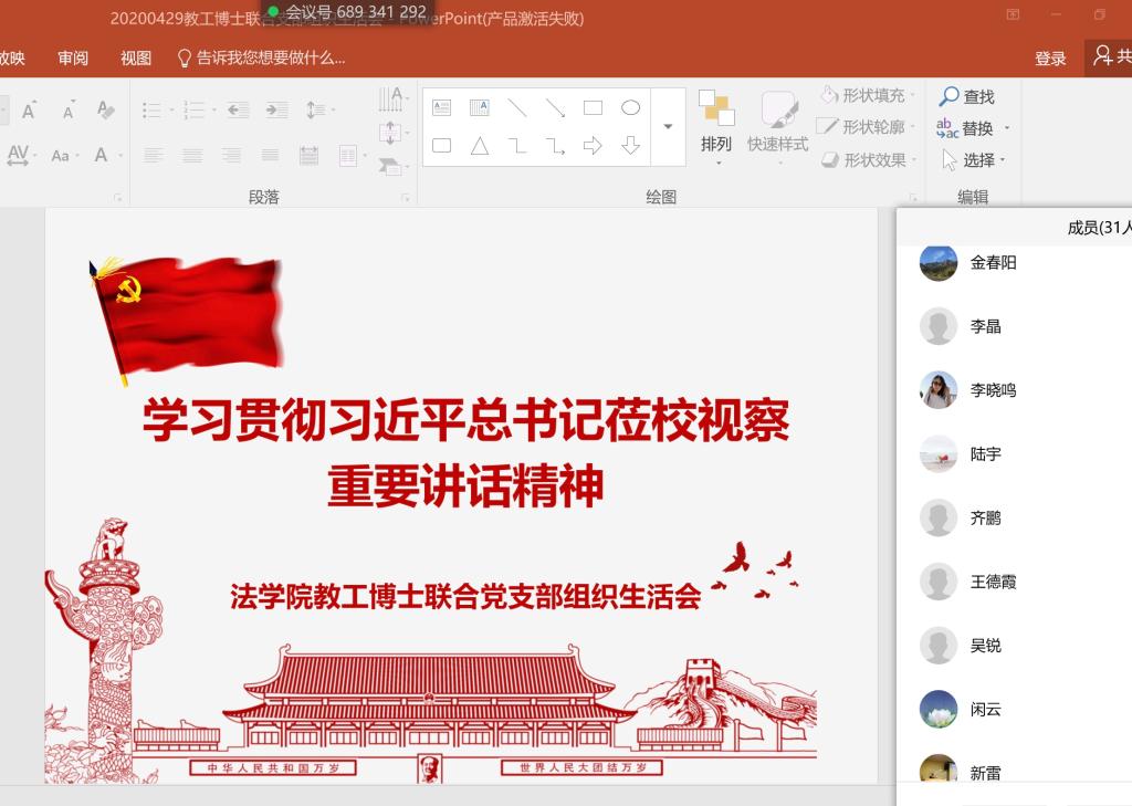 4月29日下午,开云电子体育_开云(中国)教工博士联合党支部开展线上组织生活会,深入学习贯彻习近平总书记莅校视察重要讲话精神。党支部成员通过网络平台积极参加学习,本次活动由支部书记曹毅博主持。