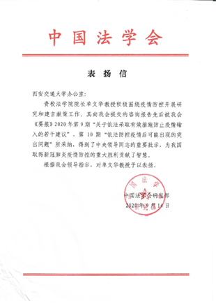 日前,中国法学会专门致函我校,感谢并表扬我校单文华教授及其团队对新冠疫情依法防控的建言贡献。来函表示,单文华教授团队的研究报告被该会先后两份《要报》采纳,“得到了中央领导同志的重要批示,为我国取得新冠肺炎疫情防控的重大胜利贡献了智慧”。研究会根据会领导的指示,特对单文华教授表示感谢和表扬。