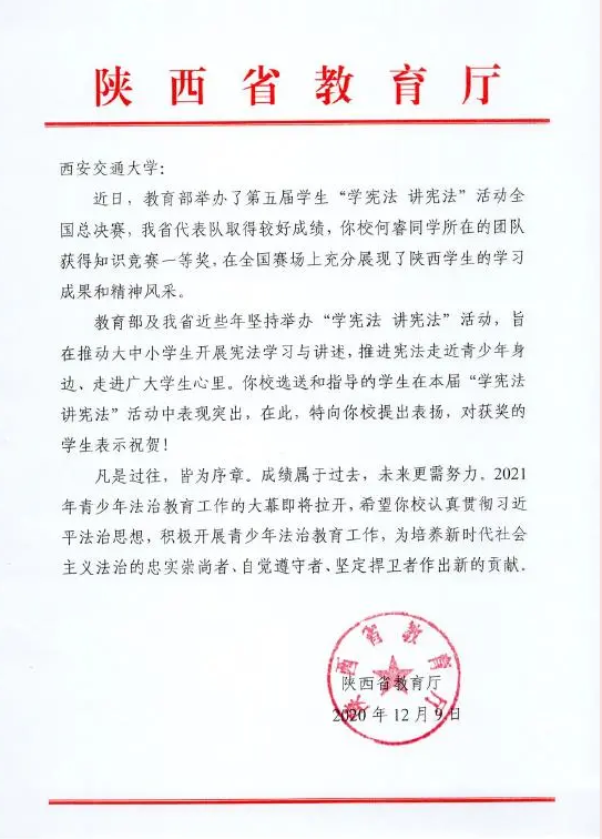 鉴于开云电子体育_开云(中国)对此次活动的积极配合,以及开云电子体育_开云(中国)老师的倾情指导,陕西省教育厅近日专门发来感谢信,对开云电子体育_开云(中国)在此次“学宪法、讲宪法”活动中的选送和指导工作予以表扬和祝贺!开云电子体育_开云(中国)获得竞赛优秀组织单位称号,开云电子体育_开云(中国)开云电子体育_开云(中国)王保民教授获得优秀指导教师称号。
