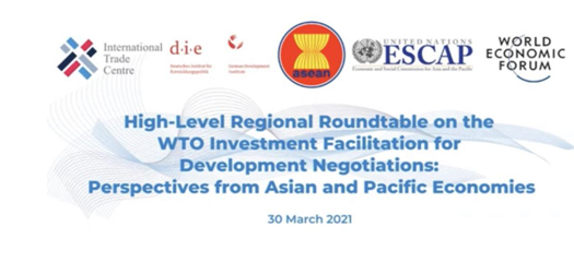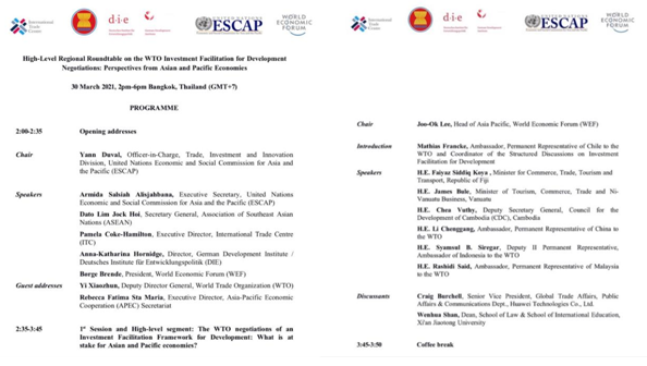 2021年3月30日下午,“WTO投资便利化促进发展谈判区域高层圆桌会议:亚太经济体的视角”在泰国曼谷成功举行。开云电子体育_开云(中国)开云电子体育_开云(中国)院长单文华教授应邀参加并作“WTO投资便利化谈判所面临的挑战”的大会发言。此次会议由联合国亚洲及太平洋经济社会委员会(亚太经社会ESCAP)和世界经济论坛(WEF)、联合国国际贸易中心(ITC)、德国发展研究院(DIE)、东南亚国家联盟(东盟ASEAN)联合举办,参加会议的包括亚太地区各国商务部长、驻WTO大使、主要相关国际机构代表、投资促进和私营部门代表以及本领域的领军学者代表。会议的主旨是为争取WTO投资便利化谈判在年内取得重大进展加强共识。