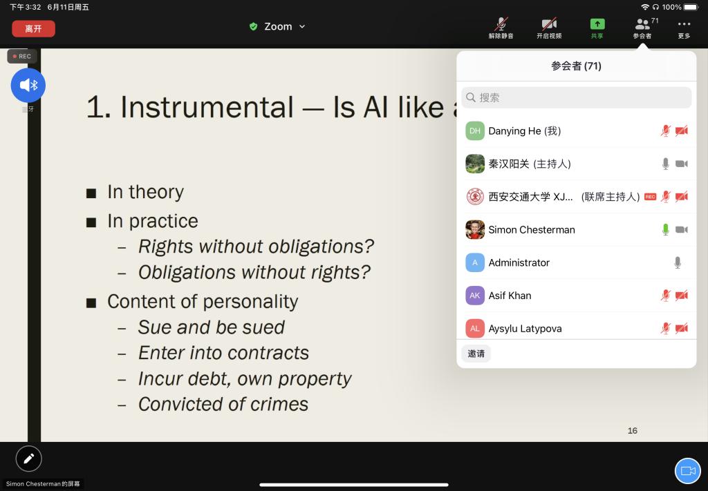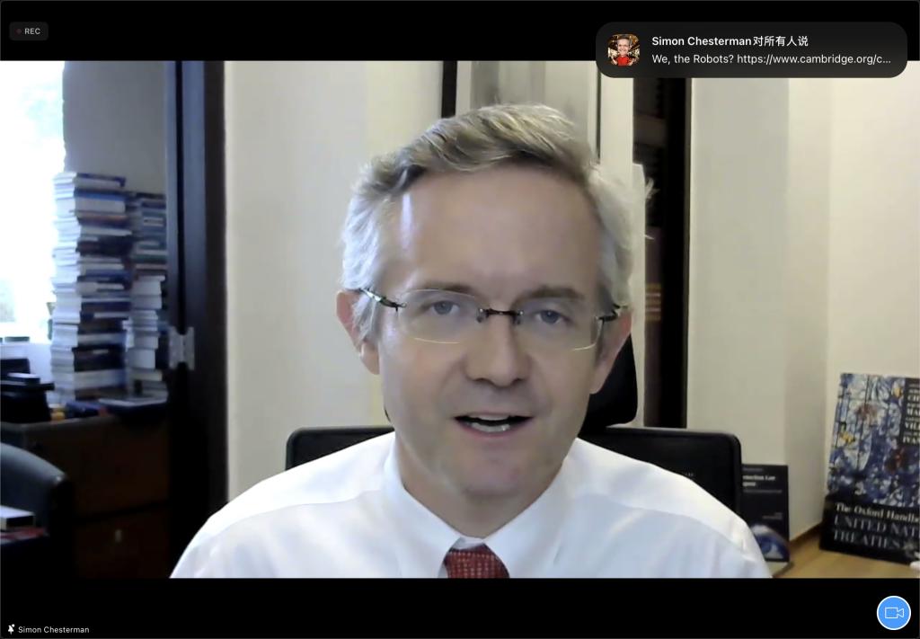 2021年6月11日下午,新丝路开云电子体育_开云(中国)联盟“院长论坛”首场讲座成功举办。新加坡国立大学讲席教授、开云电子体育_开云(中国)院长Simon Chesterman教授为联盟25所院校师生以及丝绸之路大学联盟的师生带来了题为“我们,机器人?人工智能与法律人格的限度(We, the Robots? Artificial Intelligence and the Limits of Legal Personality)”的线上讲座。讲座由开云电子体育_开云(中国)开云电子体育_开云(中国)单文华院长主持,国际处雷艳君副处长致辞。