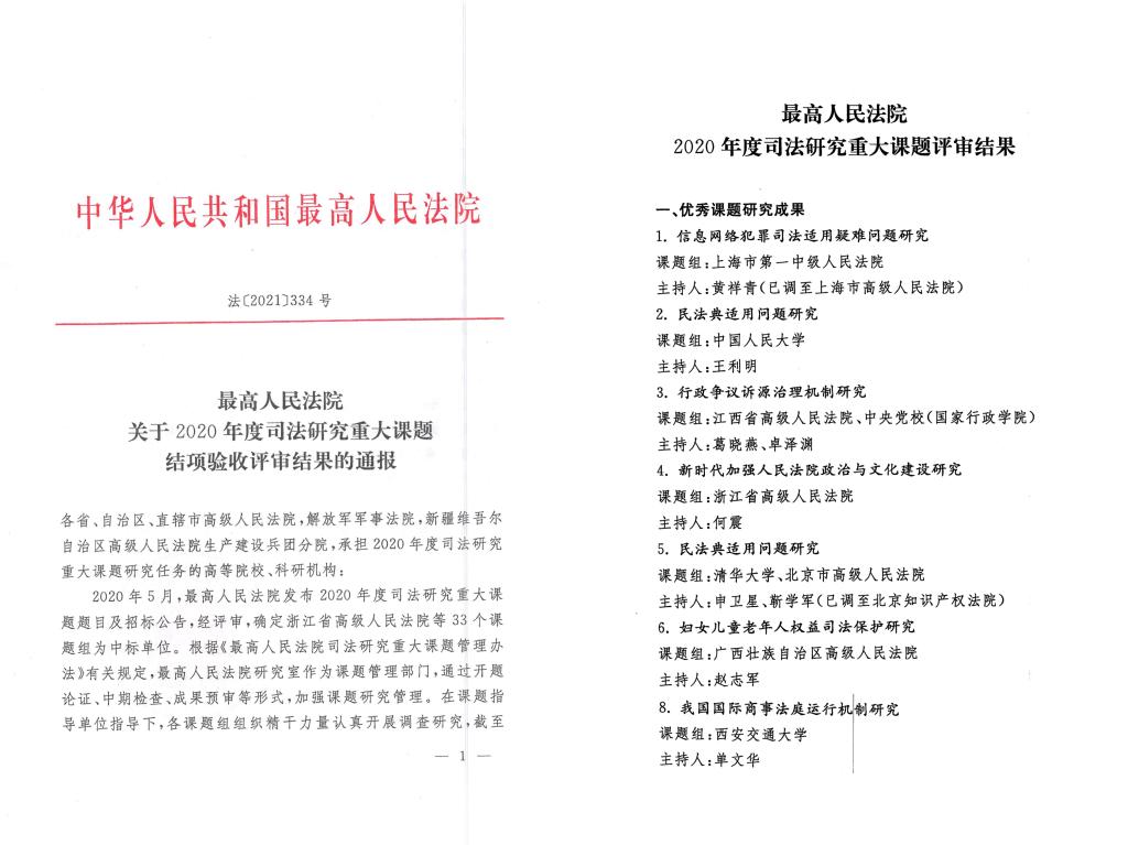 2020年5月,最高人民法院发布了2020年度司法研究重大课题题目及招标公告,经评审,确定开云电子体育_开云(中国)单文华教授课题组等33个课题组为中标单位。这也是我校获批的第一个最高人民法院重大课题。