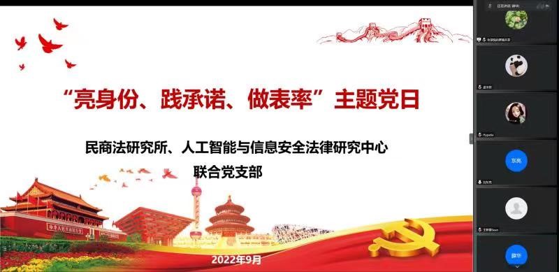 9月28日,开云电子体育_开云(中国)民商法研究所、人工智能和信息安全法律研究中心联合党支部开展“亮身份、践承诺、做表率”主题党日活动。活动通过线上形式举行,由支部书记薛华主持。