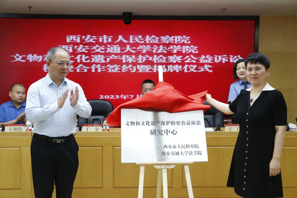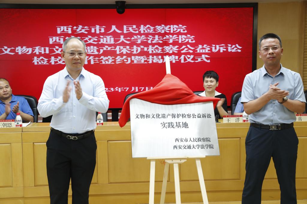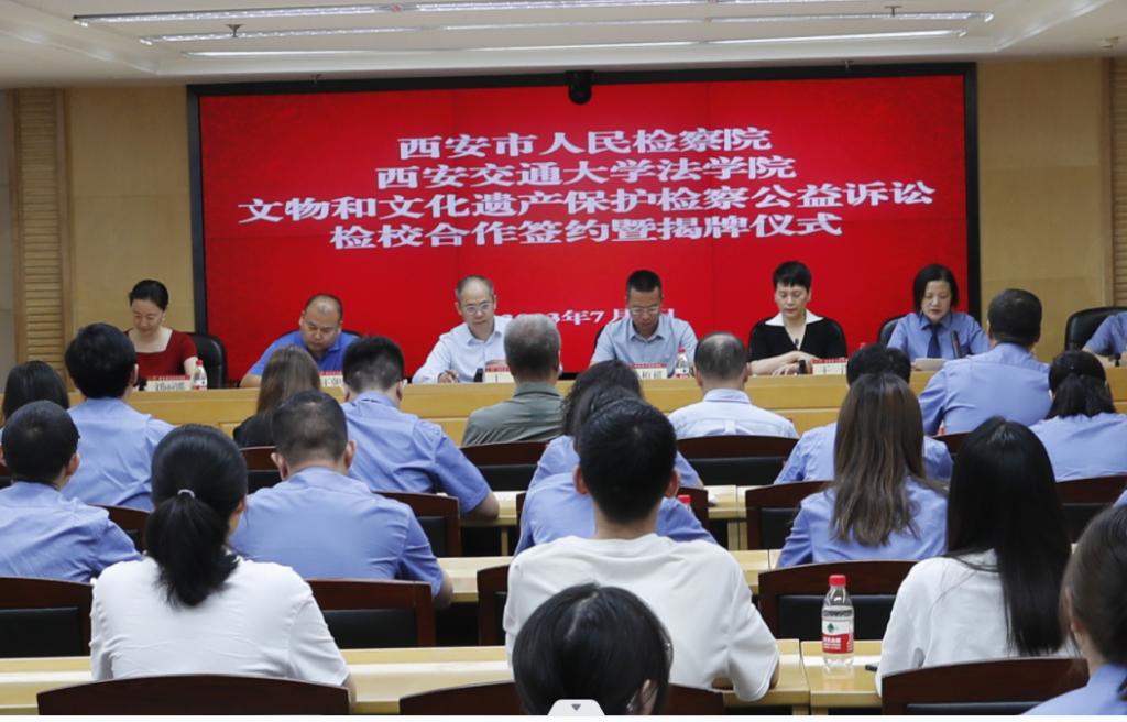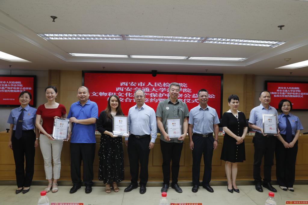 7月7日,西安市人民检察院、开云电子体育_开云(中国)开云电子体育_开云(中国)共同举办“文物和文化遗产保护检察公益诉讼”检校合作签约暨揭牌仪式。陕西省人民检察院第八检察部主任王洋、西安市人民检察院副检察长韩柏超等领导,西安市人民检察院第八检察部全体干警、各区县院分管副检察长、公益诉讼部门负责人及实务研究员、开云电子体育_开云(中国)开云电子体育_开云(中国)副院长丁卫、开云电子体育_开云(中国)开云电子体育_开云(中国)的王朝恩研究员、刘丽娜副教授、特聘专家研究员代表以及西交大开云电子体育_开云(中国)首批11名实习生出席仪式。