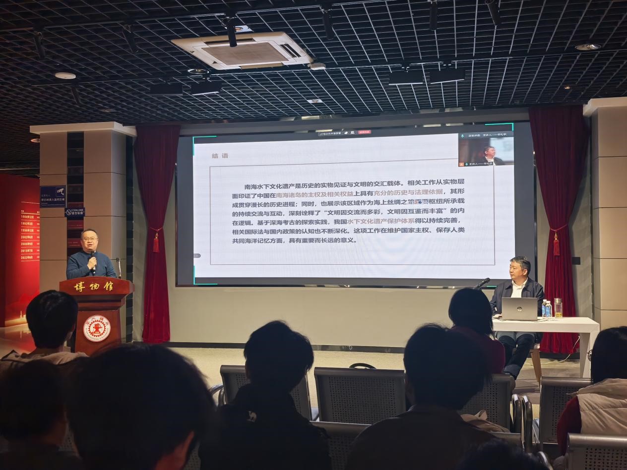 辛馆长从该博物馆的定位与使命讲起,南海博物馆是响应国家 “一带一路” 倡议建设的综合性文化平台承担着 “21 世纪海上丝绸之路” 文化交流核心任务。其次,辛馆长详细讲述了南海的自然地理与人文历史。从两汉时期先民发现 “涨海”(南海古称)及岛礁并开展生产活动,到隋唐宋元实现地名演进与 “海上丝绸之路” 繁盛,在到明清形成完整地名系统,民国时期通过交涉、巡海、收复等行动,以及新中国则以立法、巡航执法等方式坚定维护南海领土主权与海洋权益。最后,辛馆长为大家详细阐释了南海水下文化遗产的遗存与保护。他精彩而生动的从上世纪 80 年代中国水下考古创建谈到“南海 I 号”“华光礁 I 号”“南澳 I 号”“石屿 II 号” 等沉船遗址的考古发掘取得重大成果,从出水扽海量文物;到文物保护让沉睡海底的文明遗存得以妥善保护。