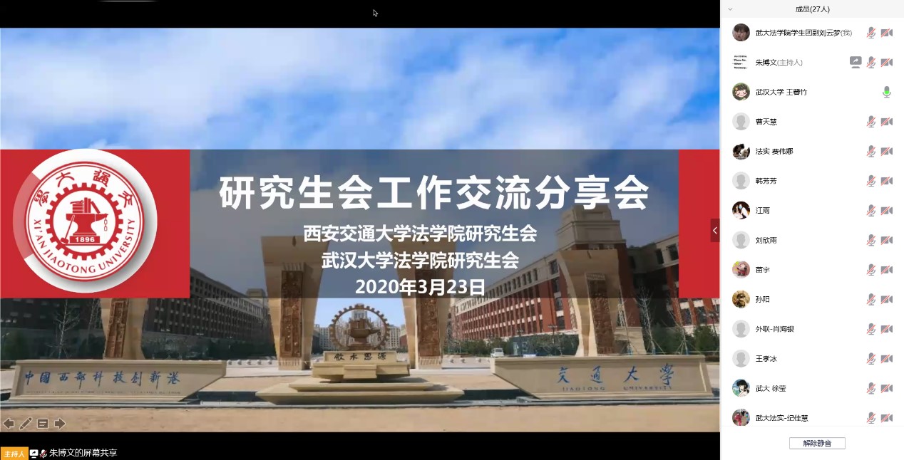 3月23日晚,西安交大开云电子体育_开云(中国)研究生会与武汉大学开云电子体育_开云(中国)研究生会利用腾讯会议平台,联合举办线上工作交流会,分享战疫心得、畅谈活动经验。两校开云电子体育_开云(中国)研究生会和有关党团学生干部二十余人参加会议,西安交大开云电子体育_开云(中国)团工委书记、研究生会主席朱博文主持会议。