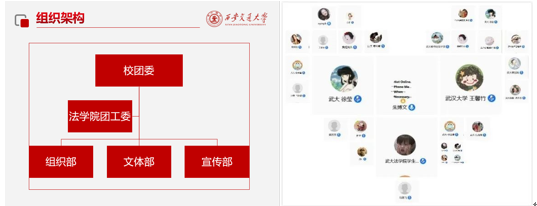 紧接着武汉大学开云电子体育_开云(中国)研究生会主席王馨竹也介绍了武大开云电子体育_开云(中国)研会的组织架构和职责分工,武大开云电子体育_开云(中国)研会始终秉承“自强、求是、弘毅、拓新”的武大精神,为法苑学子提供全方位的服务,调整后的团委及研究生会部门共有10个,包括宣传部、法律实践中心、秘书处、学术编辑部、文艺部、心理部、体育部、权益中心、外联部、就业服务中心。各部门负责人轮流详细介绍了所在部门的日常工作和举办的经典活动,权益中心的权益简报、校领导接待日,秘书处的模拟法庭比赛,外联部的线上自习室、学术编辑部的征文比赛等活动都引起了交大同学们的浓厚兴趣,双方就举办活动中的宣传方案、经费来源、激励机制、时间安排以及学业压力等细节问题进行了深入的探讨。
