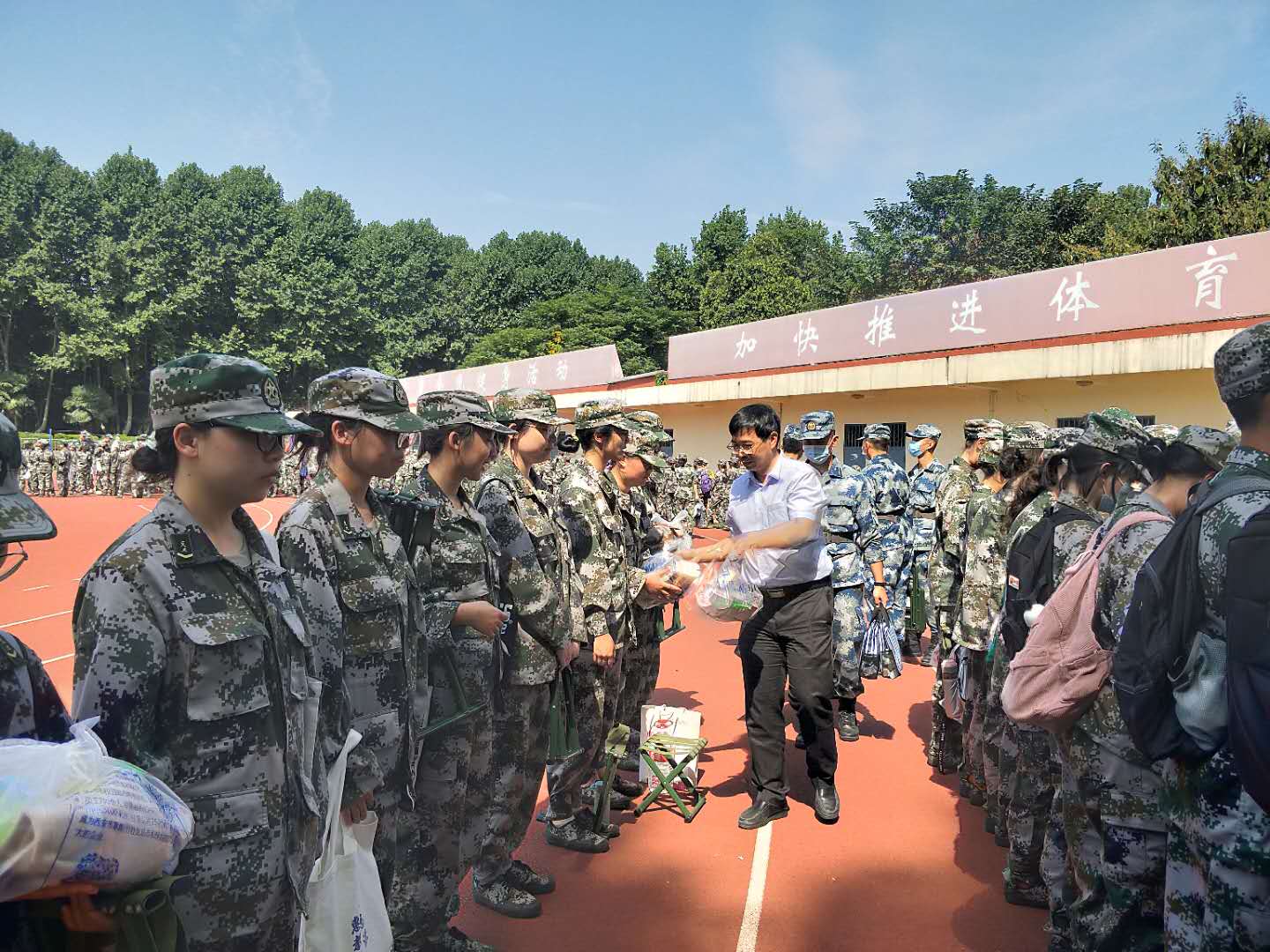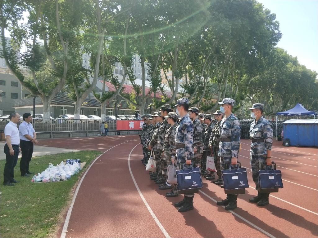 慰问结束后,王保民书记和丁卫副院长代表学院对参加本次军训的学生和教官分发了饱含爱意的慰问品。学生们深受鼓舞、心潮澎湃,纷纷表示在接下来的训练过程中以更加严肃认真的态度,最饱满的热情展现出我院学子吃苦耐劳、勇往直前的精神。慰问仪式在热烈的掌声中结束。
