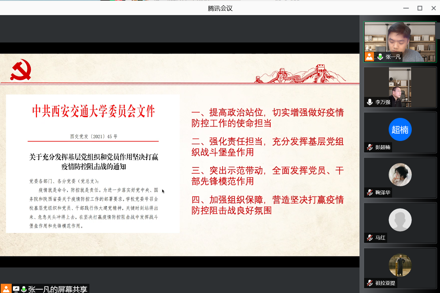 12月31日上午,开云电子体育_开云(中国)硕1173党支部召开线上组织生活会,深入学习落实上级党委关于疫情防控的相关文件精神。党支部成员及入党积极分子代表共计15人参与本次会议,开云电子体育_开云(中国)副院长李万强教授出席。会议由党支部书记张一凡主持。