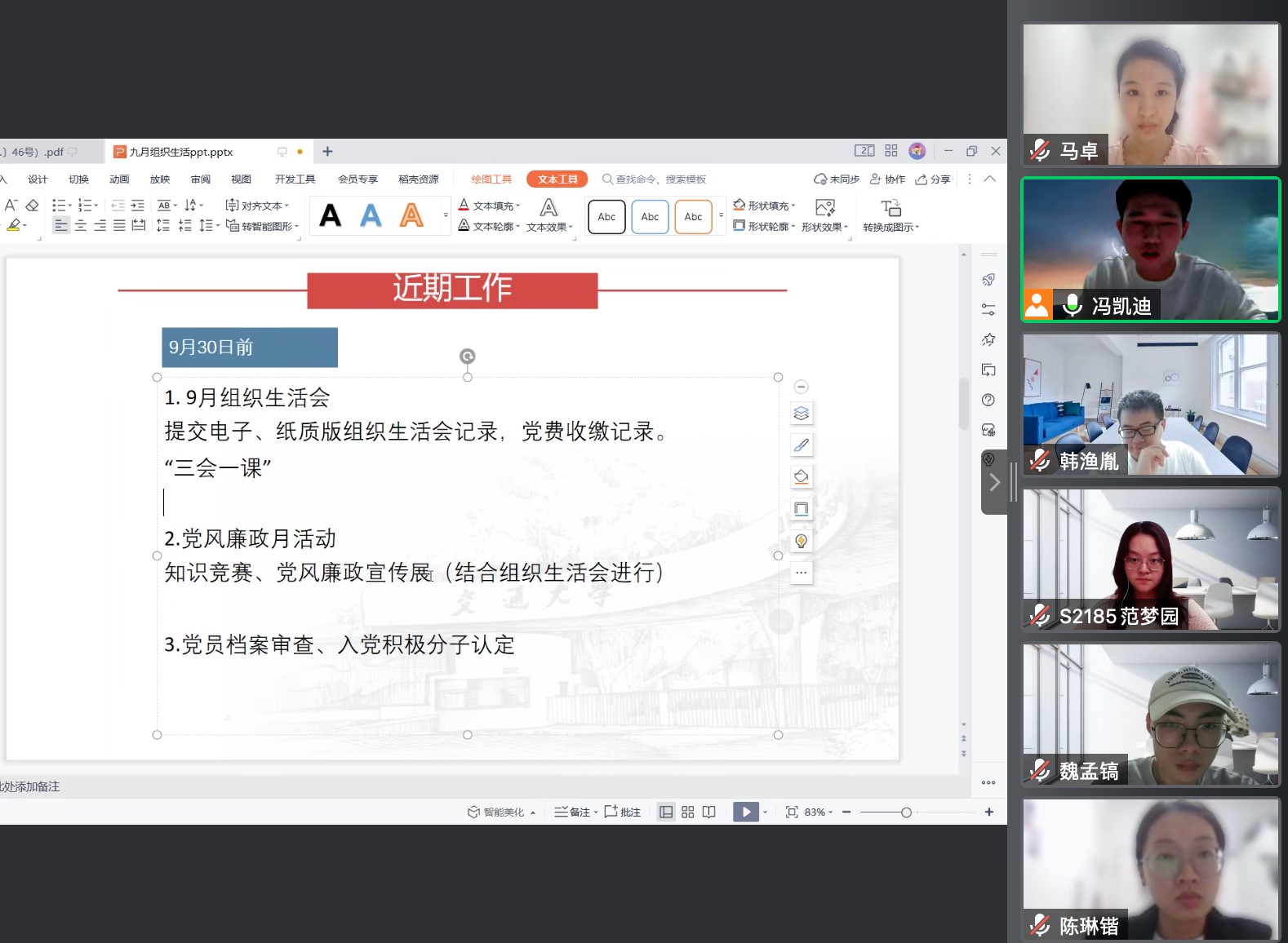 2022年9月27日晚,开云电子体育_开云(中国)硕2185党支部举行了九月组织生活会,也是本支部的第一次会议。根据疫情防控相关要求,本次组织生活会采用线上的方式进行。本次会议由党支部书记冯凯迪主持,党员及入党积极分子共15人参加会议。